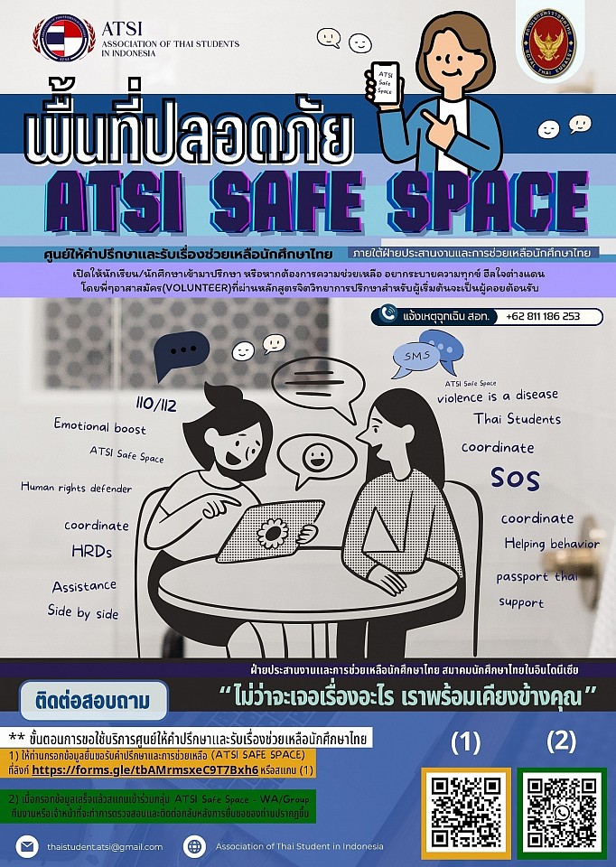 An initiative by the Association of Thai Students in Indonesia (ATSI), created to be a supportive and confidential space for Thai students facing stress, loneliness, bullying, harassment, or personal challenges while living abroad.